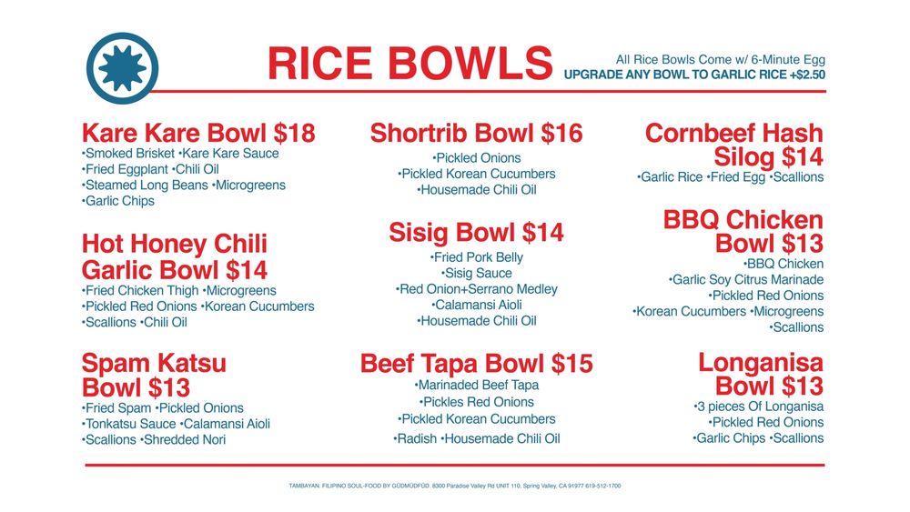 Dive into our specialty rice bowls, a creative blend of traditional Filipino ingredients with a modern twist. Each bowl is crafted with a keen eye for detail, combining perfectly cooked rice with unique proteins, fresh veggies, and our house-made sauces that pack a flavorful punch.